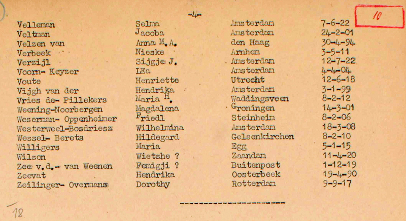 After her mother and sister Clara were also arrested in 1943, Van de Perre became a member of the TD group (The TD group was a Dutch resistance group during WW2. The letters 'TD' refer to the sabotaging of the "Tweede Distributiekaart" - in English: Second Rations Card- which the group became known for. The TD group originated in 1942 from individual help to Jewish people in hiding. When it turned out that these people in hiding could be helped by providing them with false identity papers, pedigree cards and receipt cards, the need arose to organize nationwide contacts with authorities that could play a role in providing these papers.) Under the names Wil Buter and later Marga van der Kuit, Selma did courier work throughout the Netherlands. On 26 June 1944 she was betrayed and arrested and deported to Ravensbrück (Germany) via Camp Vught (Netherlands).