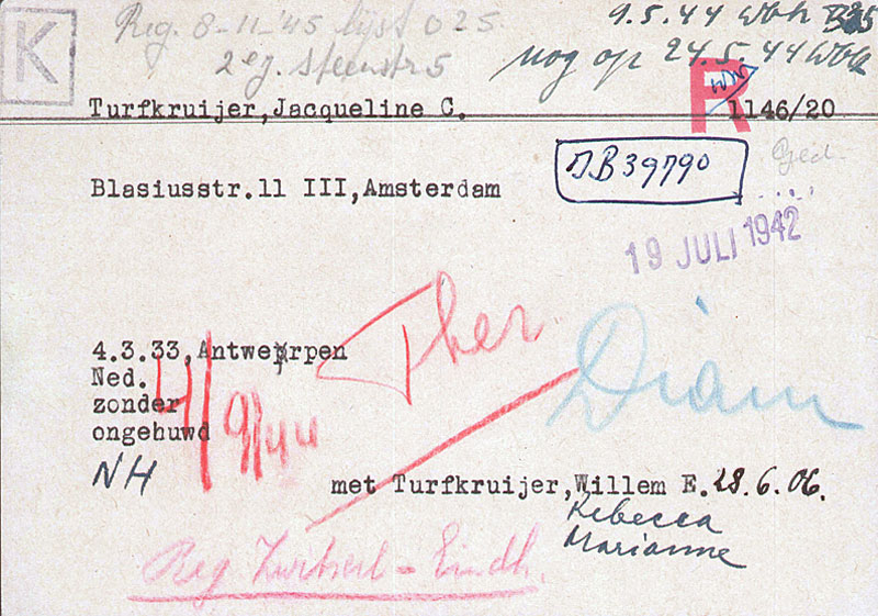 One of the sons of the first family in the Jordaan who took us in, had a crush on my sister Mary. Mary being 13 at the time, naturally did not respond to his romantic advances. In his anger he betrayed us to the authorities. I was sitting in the classroom under the name of Jacqueline Smeenk when the SS came in and took me away. My sisters was taken from the Smeenk home we were living in.