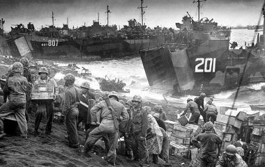At 08:59, one minute ahead of schedule, the first of an eventual 30.000 Marines of the 3rd Marine Division, the 4th Marine Division, and the new 5th Marine Division, making up the V Amphibious Corps, landed on the beach. The initial wave was not hit by Japanese fire for some time. General Kuribayashi's plan was to wait until the beach was full of the Marines and their equipment.