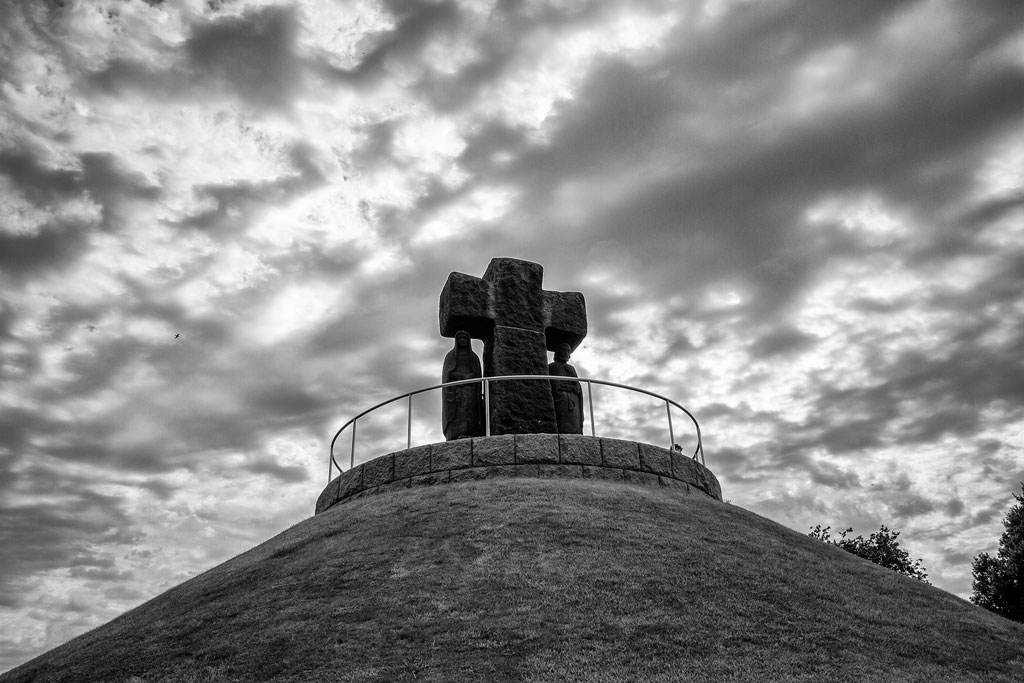 In 1954, the Franco-German War Graves Agreement ratified that the Reinternment Commission of the Volksbund could move German bodies from field graves and village cemeteries. During the removals many previously anonymous German soldiers were identified. In 1958, the youth section of the Volksbund drew people from seven nations to work on the cemetery. Layout and landscaping of the site began immediately after formal handover, with a large central tumulus (or kamaradengraben), flanked by two statues and topped by a large dark cross in basalt lava, which marks the resting place for 207 unknown and 89 identified German soldiers, interred together in a mass grave. The tumulus is surrounded by 49 rectangular grave fields with up to 400 graves each. On the large grass areas graves are identified by flat grave markers.