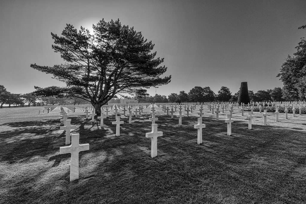 The Normandy American Cemetery and Memorial in France is located in Colleville-sur-Mer, on the site of the temporary American St. Laurent Cemetery, established by the U.S. First Army on June 8, 1944 as the first American cemetery on European soil in World War II. The cemetery site, at the north end of its half mile access road, covers 172.5 acres and contains the graves of 9,385 of our military dead, most of whom lost their lives in the D-Day landings and ensuing operations. On the Walls of the Missing, in a semicircular garden on the east side of the memorial, are inscribed 1,557 names. Rosettes mark the names of those since recovered and identified.