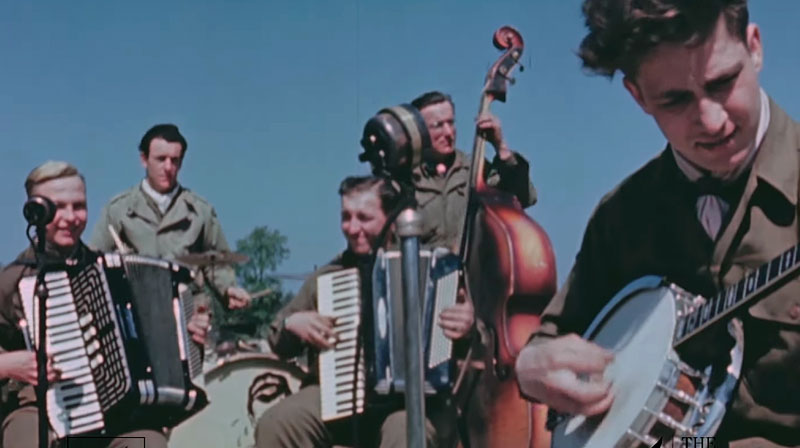 On 26 April 1945 the U.S.O. (United Service Organizations) organized this show for the troops at the Zeppelin Field of the Reichsparteitagsgelände in Nuremberg, the same place where Hitler used to stand during the Nazi Party rallies. This place covers about 11 square kilometres in the southeast of Nuremberg. Special stage for the "Yankee Doodlers" swing band.